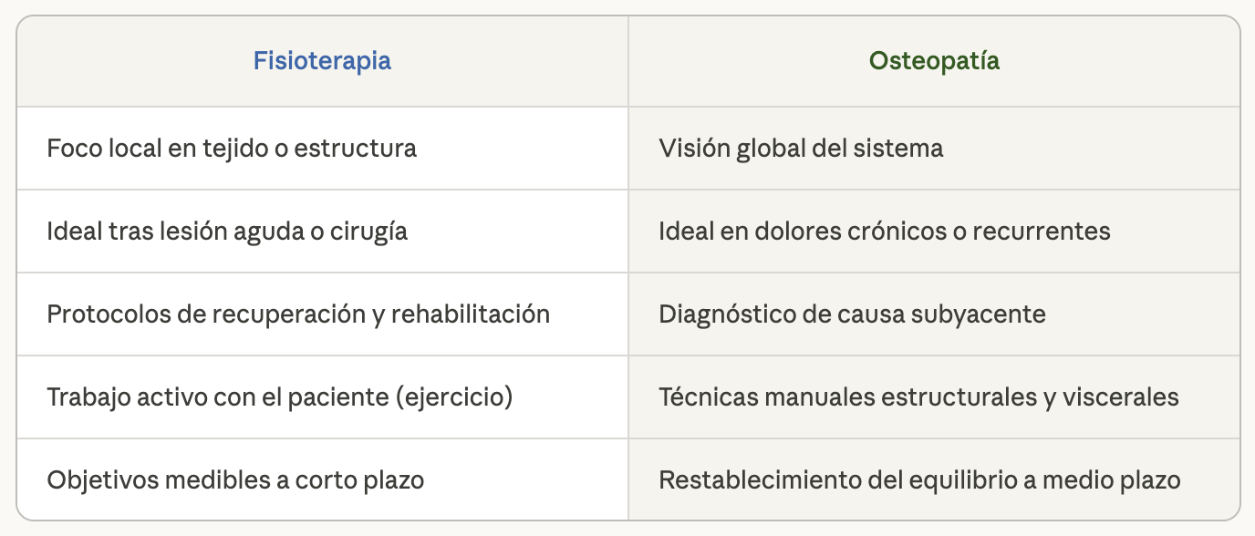 Lo importante es no automedicarse con la especialidad equivocada. Ir al fisio cuando el problema es una disfunción global puede dar alivio temporal pero no resolverá el origen. Ir al osteópata cuando tienes una lesión aguda que necesita protocolo de recuperación puede retrasarte semanas.